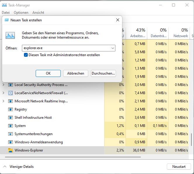 4. Geben Sie im Fenster Neuen Task erstellen in das Feld Öffnen die Datei explorer.exe ein und aktivieren Sie das Kontrollkästchen Diesen Task mit Administratorrechten erstellen.