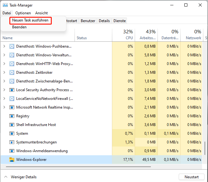 2. Suchen Sie im Pop-up-Fenster des Task-Managers Ihren Windows Explorer-Dienst, klicken Sie mit der rechten Maustaste darauf und wählen Sie Task beenden.