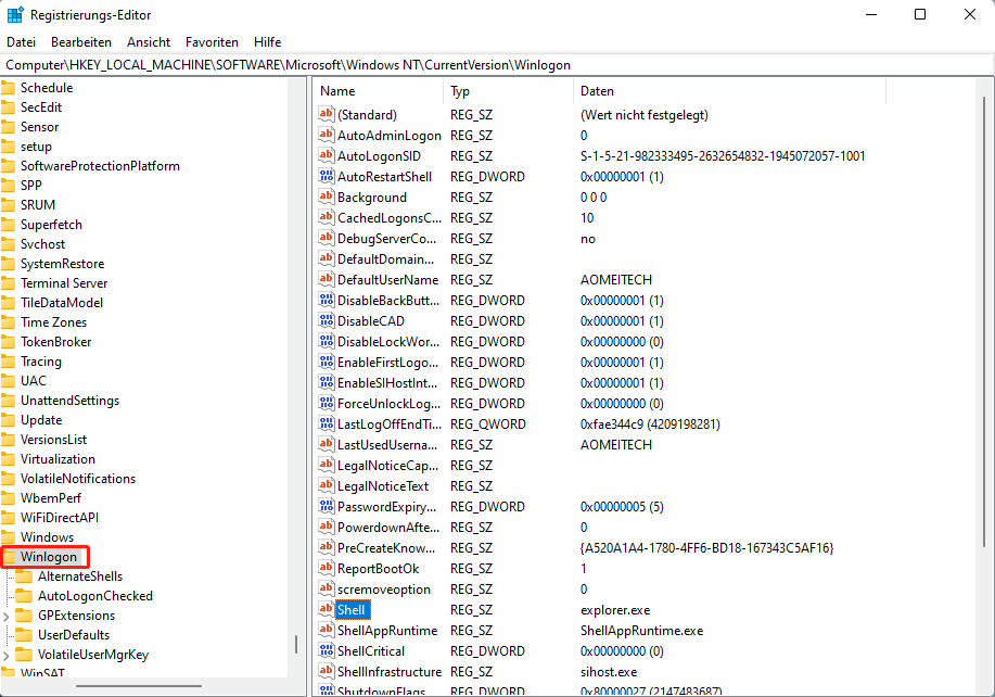 4. Klicken Sie auf der linken Seite einmal auf den Winlogon-Ordner, und doppelklicken Sie auf der rechten Seite auf Shell.