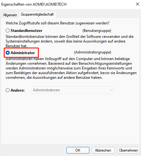 Lösung 1. Konto auf Administrator setzen