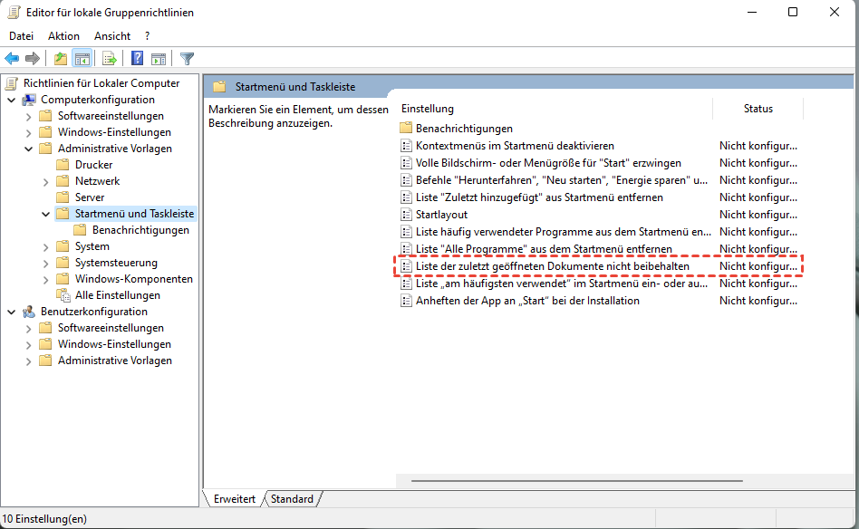 2. Suchen Sie den folgenden Pfad: Computerkonfiguration > Administrative Vorlagen > Startmenü und Taskleiste.