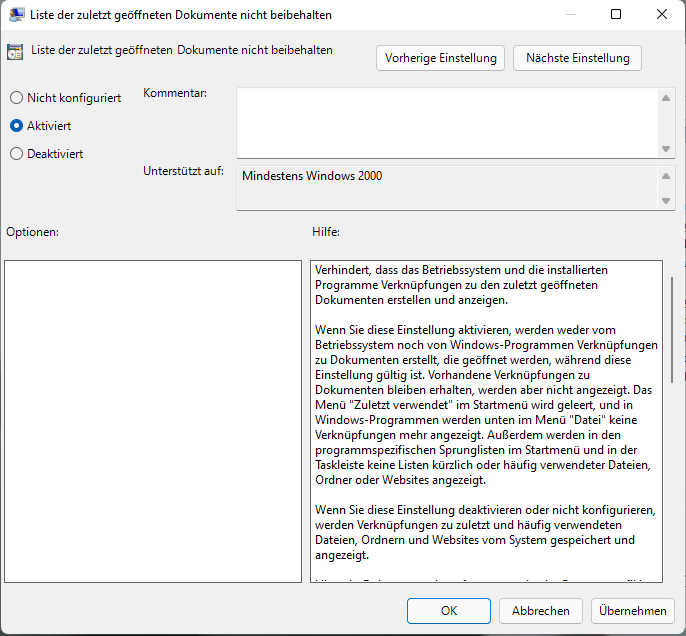 Windows 11 zuletzt verwendete Dateien deaktivieren über die Gruppenrichtlinie