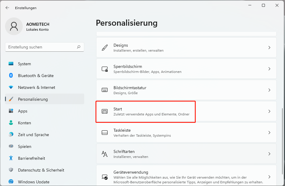2. Klicken Sie im linken Bereich auf Personalisierung, scrollen Sie in der Liste nach unten und klicken Sie auf Start.