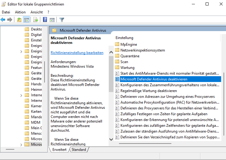3. Navigieren Sie zu folgendem Pfad und doppelklicken Sie auf Microsoft Defender Antivirus deaktivieren im rechten Fensterbereich.