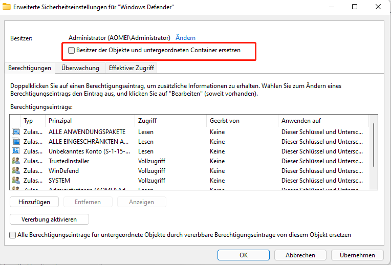 4. Klicken Sie dann im Fenster Berechtigungen für Windows Defender auf die Registerkarte Erweitert. Klicken Sie dann rechts neben dem Feld Besitzer auf Ändern.