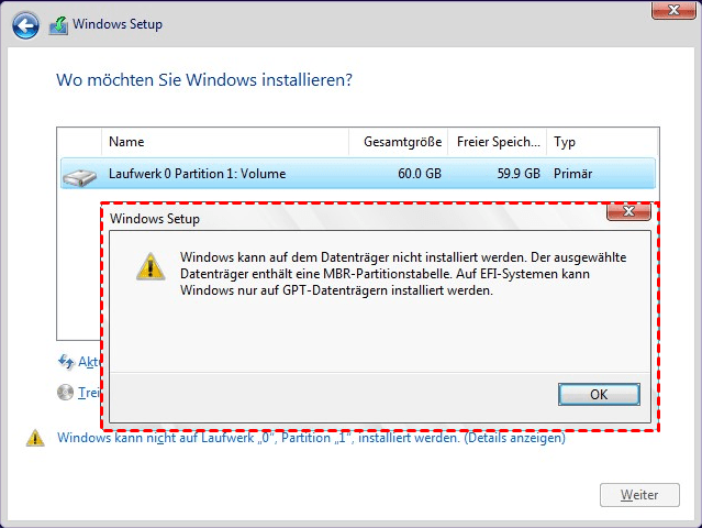 So beheben Sie den Fehler „Der ausgewählte Datenträger enthält eine MBR-Partitionstabelle“