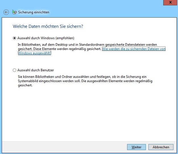 Der Assistent "Sichern und Wiederherstellen" stellt Nutzern zwei Optionen zur Verfügung: Auswahl durch Windows oder Auswahl durch Benutzer - Sie können manuell zu sichernde Bibliotheken und Ordner auswählen und festlegen.