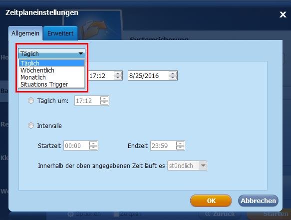 AOMEI Backupper verfügt hauptsächlich über vier Backup-Optionen, nämlich, Systemsicherung, Partitionssicherung und Festplattensicherung. Wir empfehlen Ihnen, mit der Systemsicherung Win7 automatische Sicherung einzurichten. Mit diesem Feature können Sie eine bestimmte Zeit für Sicherungsaufgabe vordefinieren. Und darüber hinaus bietet AOMEI Backupper einen Zeitplan-Assistenten, um komplexe Sicherung zu planen.