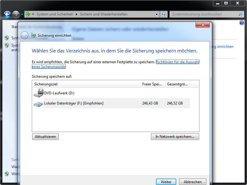 2. Sie wählen eine Partition, um die Windows 7 Datensicherung zu speichern und klicken Sie auf „Weiter“. Wenn Sie die Daten in Netzwerk speichern, können Sie Ihr Passwort teilen.