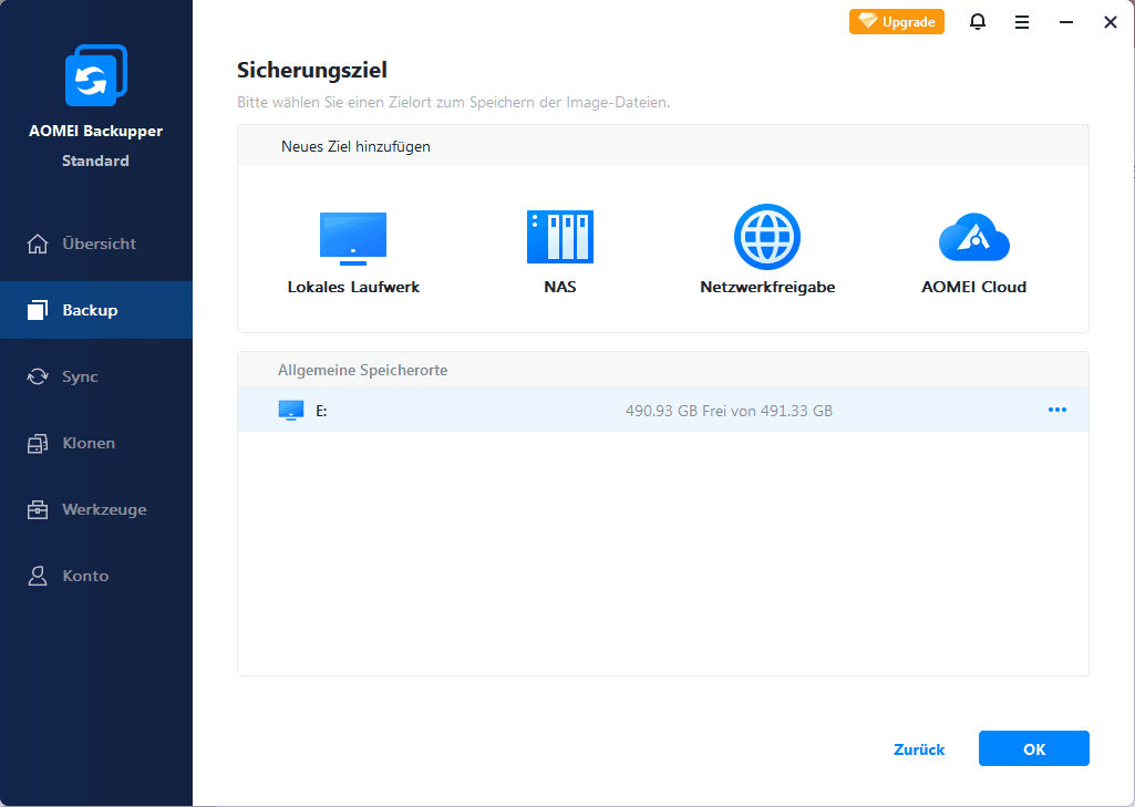 Es ermöglicht Ihnen die Sicherung an verschiedenen Speicherorten, wie z. B. lokalen / externen Festplatten, USB-Sticks, NAS-Geräten, Netzwerkspeichern und Clouds. Im Vergleich zu traditionellen Festplatten hat die Software 1 TB kostenlose AOMEI Cloud eingebaut, mit der Sie auch Ihre Dateien in der Cloud sichern können, um lokalen Speicherplatz freizugeben. Sie müssen einfach nur ein AOMEI-Konto registrieren, dann können Sie AOMEI Cloud 15 Tage lang kostenlos nutzen. Für längere Nutzung können Sie die Software auf die Professional-Version upgraden.