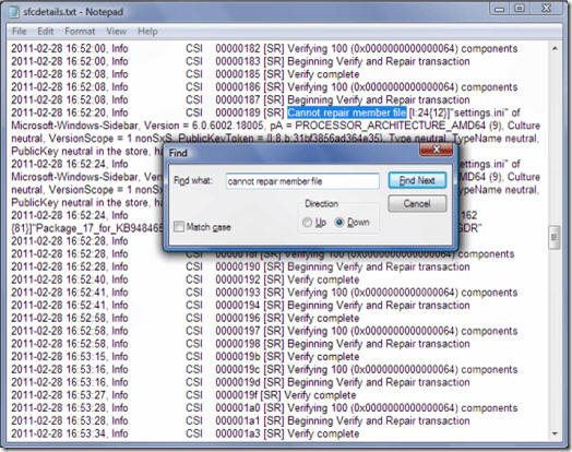 findstr/c:”[SR]” %windir%\logs\cbs\cbs.log >sfcdetails.txt