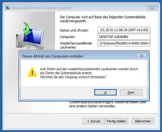 🔔 Tipp: Wenn Sie die Warnmeldung „Auf dem Computer wurde kein Systemabbild gefunden“sehen, schließen Sie die Sicherungsfestplatte mit dem gespeicherten Systemabbild an Ihren Computer an und klicken Sie auf Wiederholen.