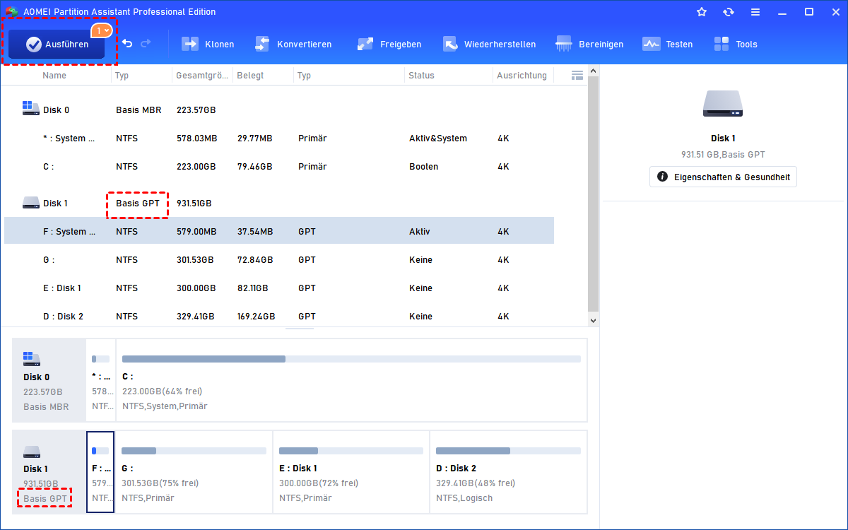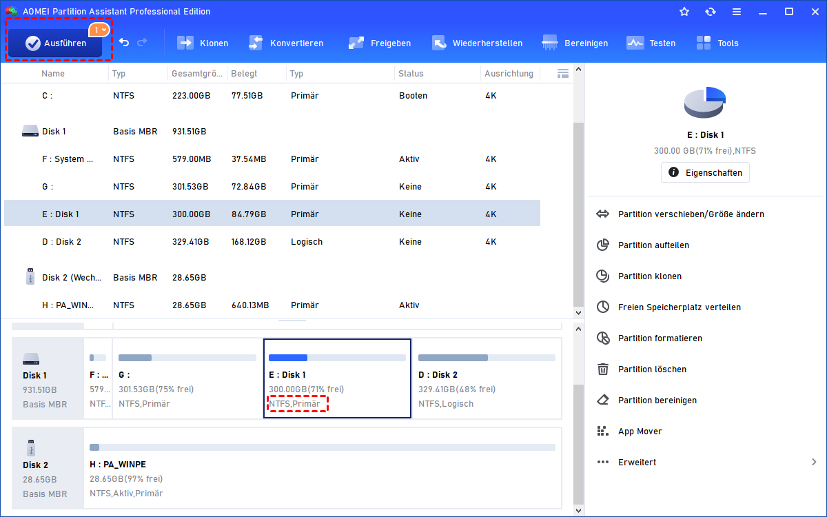 Schritt 2. Danach zeigt Ihnen die Software das endgültige Ergebnis. Sie können weiterhin bestimmen, ob Sie diese Operation durchführen möchten. Wenn ja, klicken Sie bitte auf Ausführen, um fortzufahren.