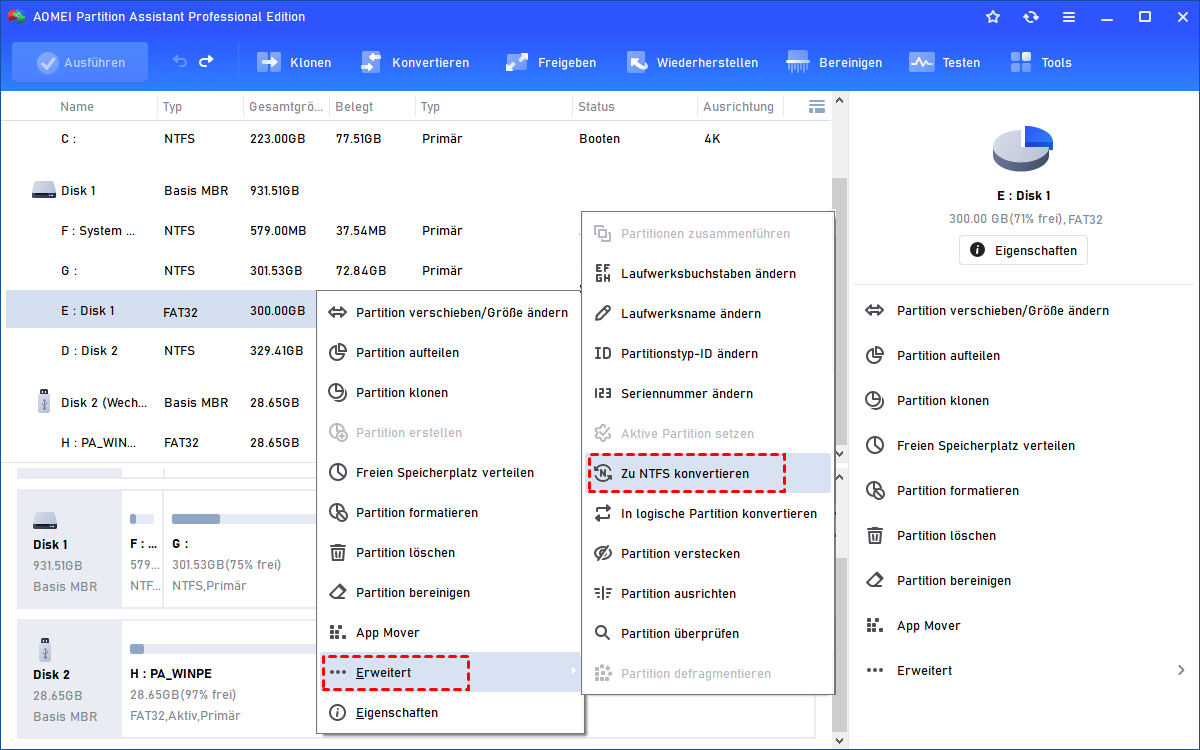 Schritt 1. Starten Sie diesen Partition Manager, dann sehen Sie seine Hauptseite. Klicken Sie auf die FAT32-Partition und wählen Sie Erweitert und Zu NTFS konvertieren.