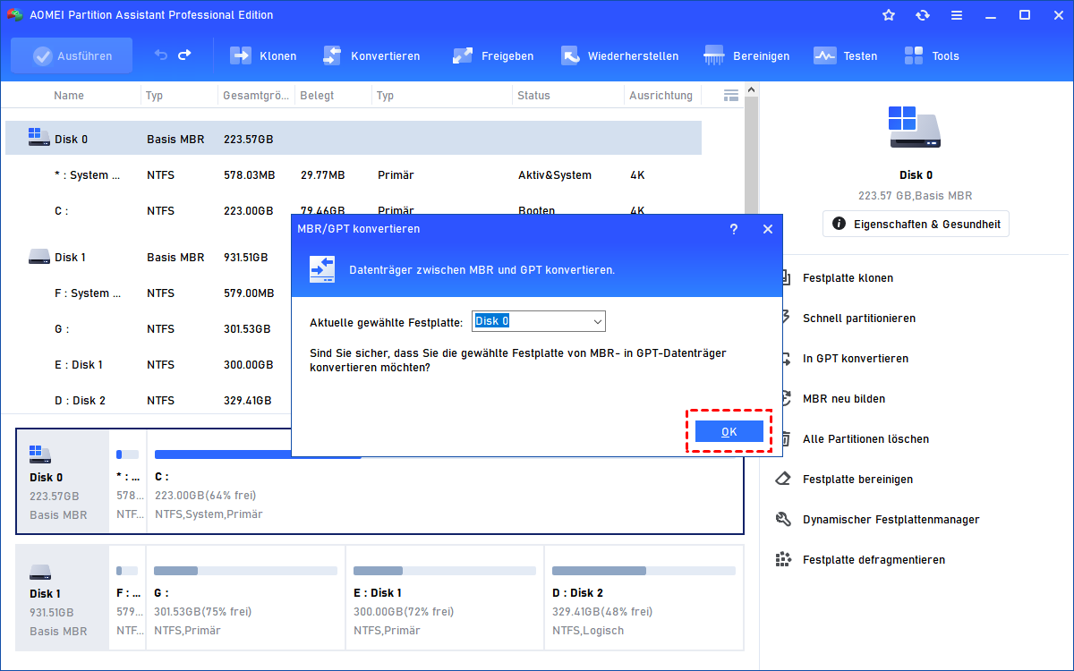 Anschließend erhalten Sie in einem Popup-Fenster eine Meldung wie „Sind Sie sicher, dass Sie die gewählte Festplatte von MBR- in GPT-Datenträger konvertieren möchten?“. Klicken Sie auf OK, um diese Operation zu bestätigen.