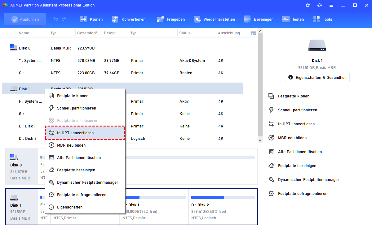 Schritt 1. Laden Sie AOMEI Partition Assistant Professional herunter, installieren und genießen Sie es. Klicken Sie mit der rechten Maustaste auf die Festplatte und wählen Sie In GPT konvertieren.