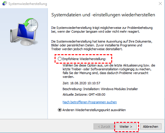 Schritt 2. Wählen Sie eine der Optionen wie folgt aus, und folgen Sie dem Assistenten bis zum letzten Schritt. Für den Systemwiederherstellungspunkt haben Sie zwei Optionen, einschließlich Empfohlene Wiederherstellung, Anderen Wiederherstellungspunkt auswählen. Wenn der empfohlene Wiederherstellungspunkt verfügbar ist, sollten Sie ihn besser ankreuzen. Wenn nicht, können Sie „Anderen Wiederherstellungspunkt auswählen“ aktivieren und den verfügbaren Wiederherstellungspunkt suchen.