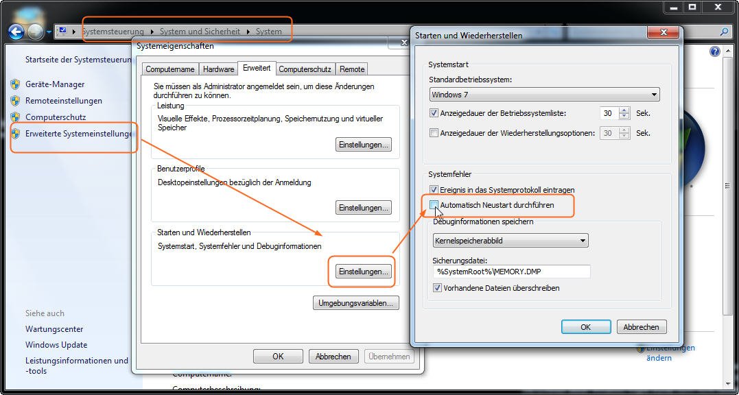 Natürlich können Sie auch die Probleme verhindern, bevor sie entstehen. Das heißt, deaktivieren Sie „Automatisch deaktivieren" vor dem Fehler. Öffnen Sie Systemsteuerung -> System ->Erweiterte Systemeinstellungen, dann klicken Sie Einstellungen unter Starten und Wiederherstellen, haken Sie die Option Automatisch Neustart durchführen NICHT, dann wird es deaktiviert.