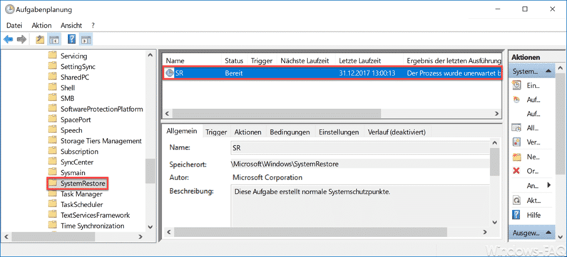 2. Navigieren Sie im linken Fensterbereich zu Aufgabenplanungsbibliothek > Microsoft > Windows > Systemwiederherstellung.