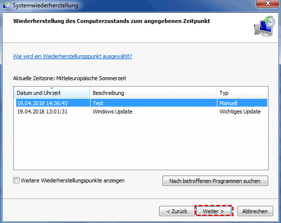 3. Es werden die letzten Wiederherstellungspunkte aufgelistet und der neueste Wiederherstellungspunkt ist ausgewählt. Sie können auf Weitere Wiederherstellungspunkte anzeigen klicken, um weitere zu sehen. Wählen Sie den gewünschten Wiederherstellungspunkt und klicken Sie auf Weiter.