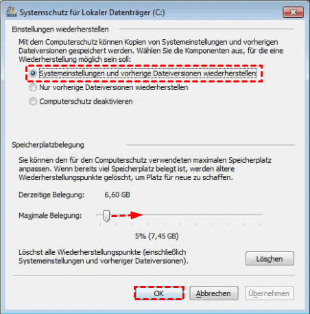 Sie können angeben, was Sie schützen möchten und welchen Speicherplatz Sie für Systemwiederherstellungspunkte verwenden.
