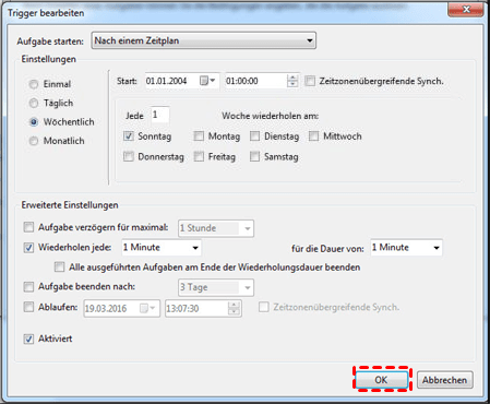 5. Legen Sie die geplante Zeit für die Durchführung der Aufgabe fest und klicken Sie zur Bestätigung auf OK.