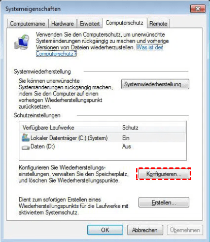 2. Systemwiederherstellung aktivieren: In Windows 7 ist der Schutz des Laufwerks C: standardmäßig aktiviert. Wenn Sie auch auf anderen Laufwerken Wiederherstellungspunkte erstellen möchten, können Sie den Schutz für das jeweilige Laufwerk aktivieren, indem Sie auf „Konfigurieren“ klicken.