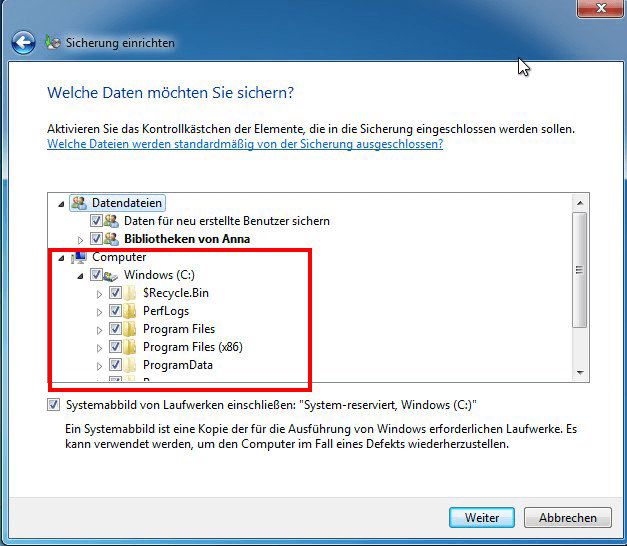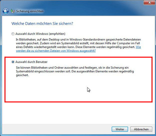 4. Wählen Sie, welche Daten gesichert werden sollen, indem Sie „Auswahl durch Windows" oder „Auswahl durch Benutzer" auswählen, um eine benutzerdefinierte Sicherung zu erstellen.