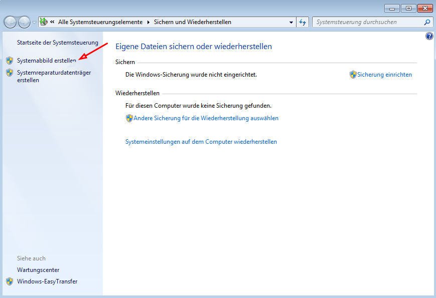 Schritt 2. Öffnen Sie das Kontrollfeld Windows 7-Dateiwiederherstellung und klicken Sie auf Systemabbild erstellen.
