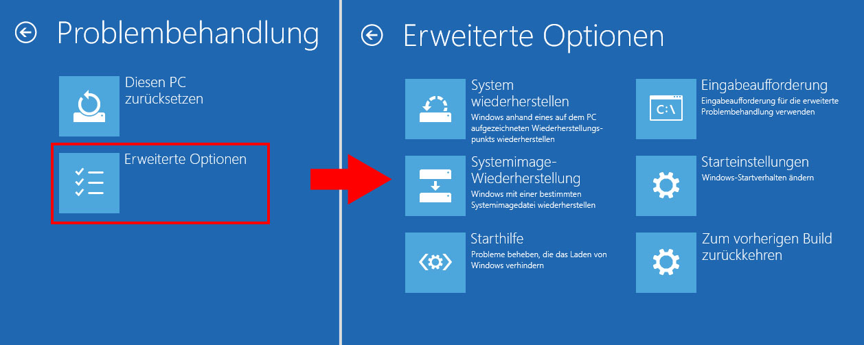 Darüber hinaus können Sie ein Wiederherstellungslaufwerk erstellen. Es kann Ihnen auch helfen, den Computer mit Problemen wiederherzustellen. Sie können von dem Wiederherstellungslaufwerk booten und zu Problembehandlung > Erweiterte Optionen > Systemimage-Wiederherstellung navigieren und dann die restlichen Schritte gemäß den Anweisungen ausführen.