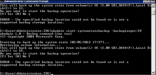 Beispiel: Wbadmin start systemstatebackup –backupTarget:f: