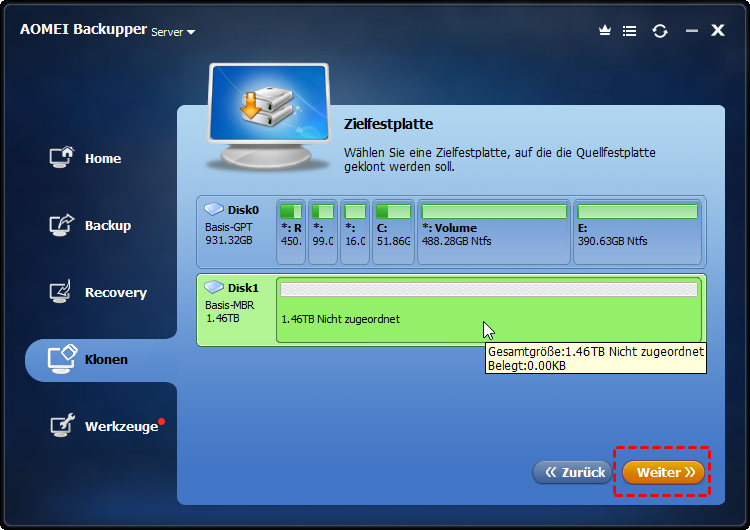 Wählen Sie die Ziel-HDD oder -SSD, auf die Sie Windows Server übertragen möchten, als Zielfestplatte aus (hier ist Disk 1). Drücken Sie danach auf Weiter.