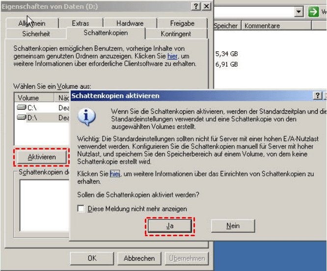 Schritt 3. Im Eigenschaftenfenster navigieren Sie zum Tab „Schattenkopien“ und klicken auf Aktivieren. Ein Bestätigungsfenster wird angezeigt, in dem Sie auf Ja klicken sollten, um mit der Erstellung fortzufahren.