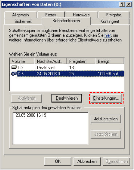 Schritt 5. Um die Einstellungen der Schattenkopie weiter anzupassen, klicken Sie auf Einstellungen. Dort können Sie die maximale Kopiergröße festlegen, den Speicherort für Schattenkopien festlegen und einen benutzerdefinierten Sicherungszeitplan erstellen.