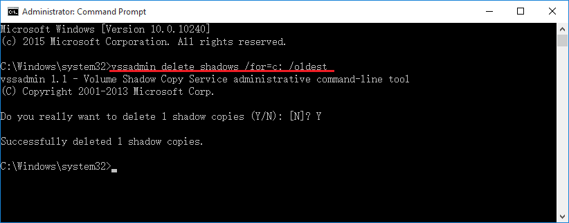 - Um die älteste Schattenkopie auf einem bestimmten Volume zu löschen, geben Sie den folgenden Befehl ein und drücken die Eingabetaste.