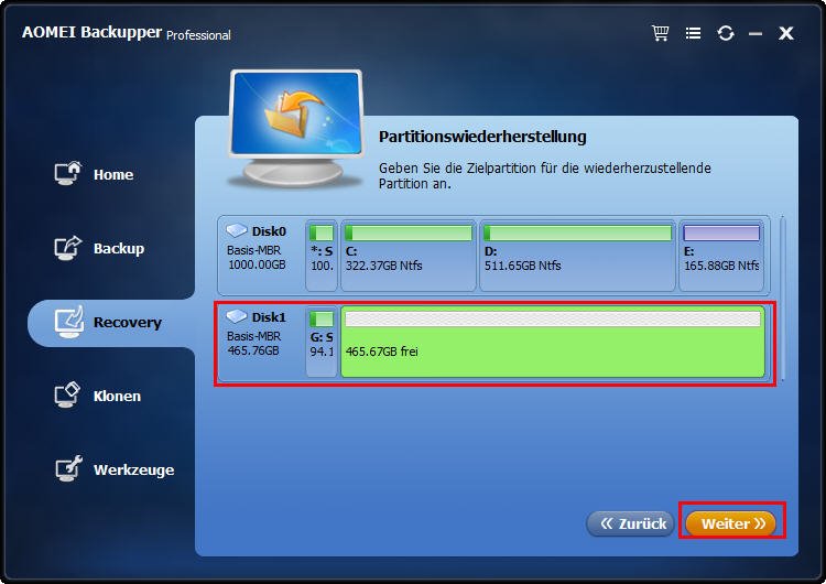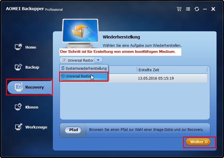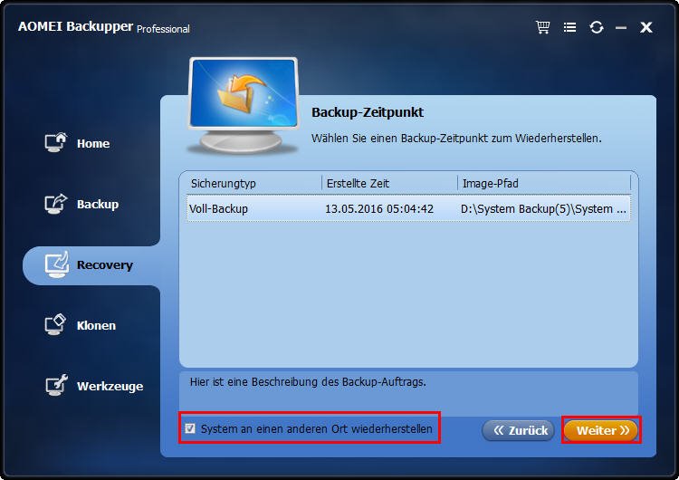Schritt 2. Klicken Sie bitte auf Wiederherstellen und Aufgabe wählen. Lokalisieren Sie ein System-Image, das Sie wiederherstellen wollen. Und klicken Sie bitte auf Weiter.