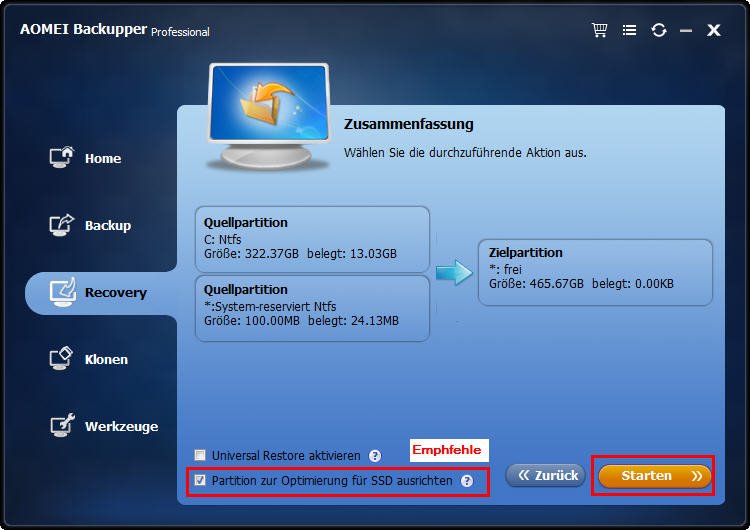 Schritt 5. Sie werden finden, dass die Option Universal Restore automatisch ausgewählt haben, um sicherzustellen, dass das System nach der Wiederherstellung auf neue Festplatte bootfähig ist. Zum Schluss klicken Sie auf "Starten". (Wenn Ihre Zielfestplatte ist SSD, empfehlen wir Ihnen die Funktion SSD ausrichten. )