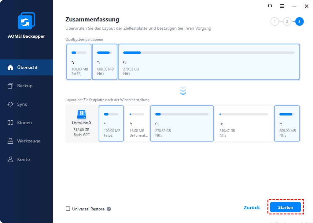 Schritt 5. Bestätigen Sie die Operationen in diesem Fenster und klicken Sie auf Starten.