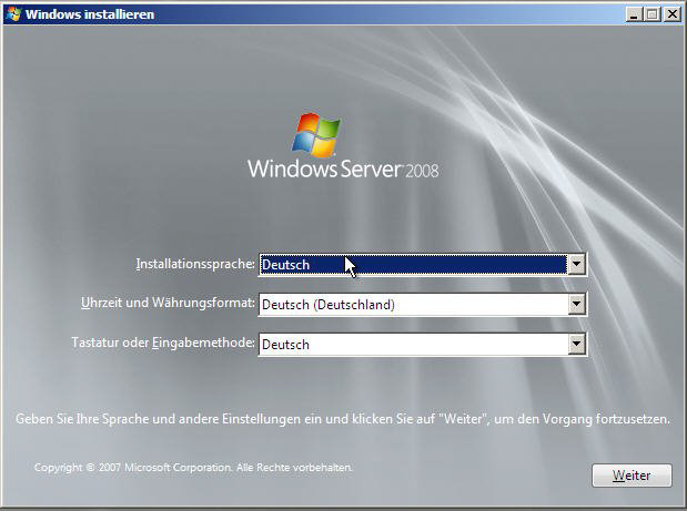 1. Legen Sie die Windows Server Installations-CD in Ihren neuen Server ein und starten Sie ihn von dort aus. Wählen Sie die Sprache und die Tastatur aus und klicken Sie auf „Weiter“.