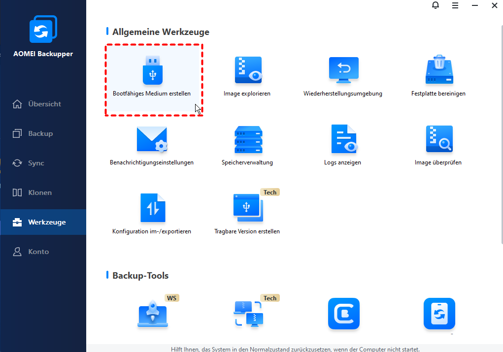 Schritt 2. Installieren Sie AOMEI Backupper Server und starten Sie es. Wählen Sie Werkzeuge und dann Bootfähiges Medium erstellen.