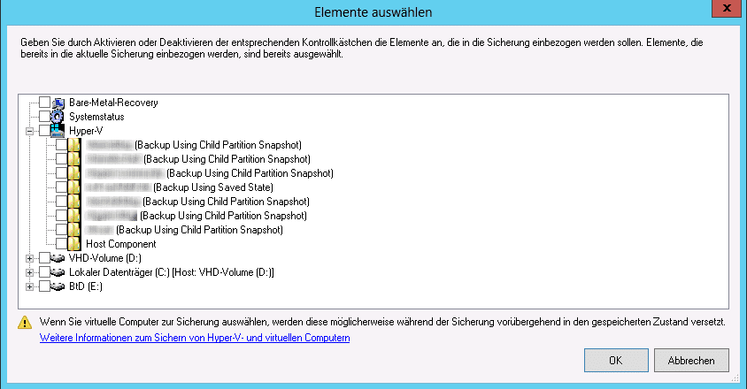 3. Klicken Sie im Bildschirm „Elemente auswählen“ auf die Hyper-V virtuelle Maschine, um sie in die Sicherung einzubeziehen.