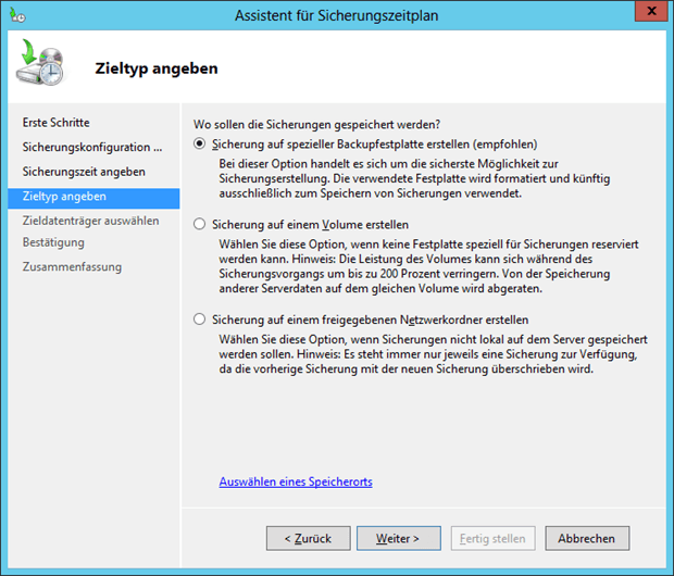 5. Geben Sie das Ziellaufwerk für die Sicherung an. Sie können die Sicherung auf spezieller Festplatte, einem Volume oder einem freigegebenen Netzwerkordner speichern.