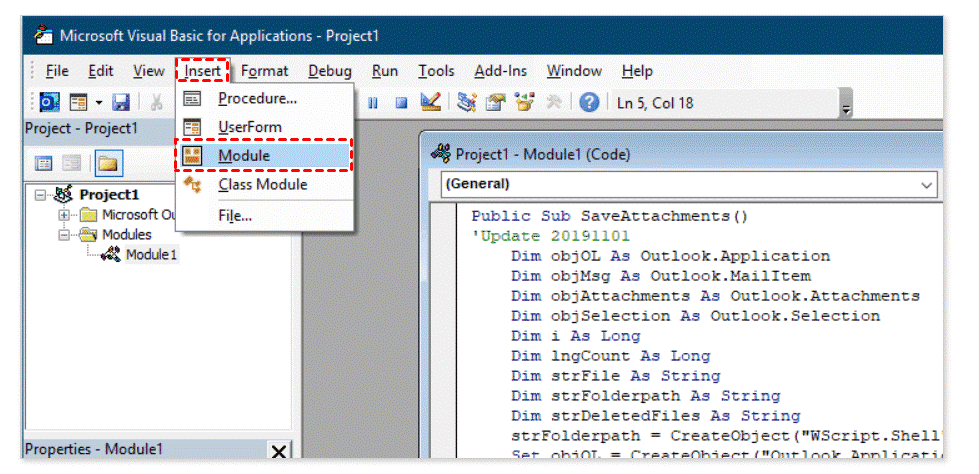 4. Click Insert > Module to open the Module window. Paste one of the provided VBA code examples.