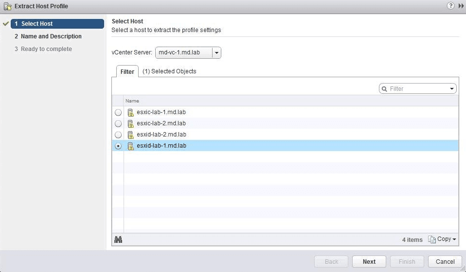 2. Follow the Extract Host Profile wizard. Select the ESXi host from which you want to extract all the settings from, and provide Name and Description to identify.