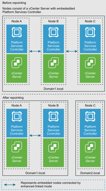 - For vCenter 6.7 with an embedded PSC, VMware provide Cross Domain Repoint feature to repoint an embedded node to a new domain to separate the vCenter from the original domain.
