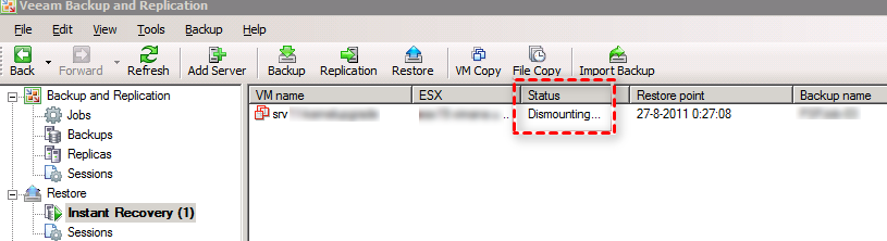 Instant VM Recovery stuck in “Dismounting” for a day? The VM is deleted.