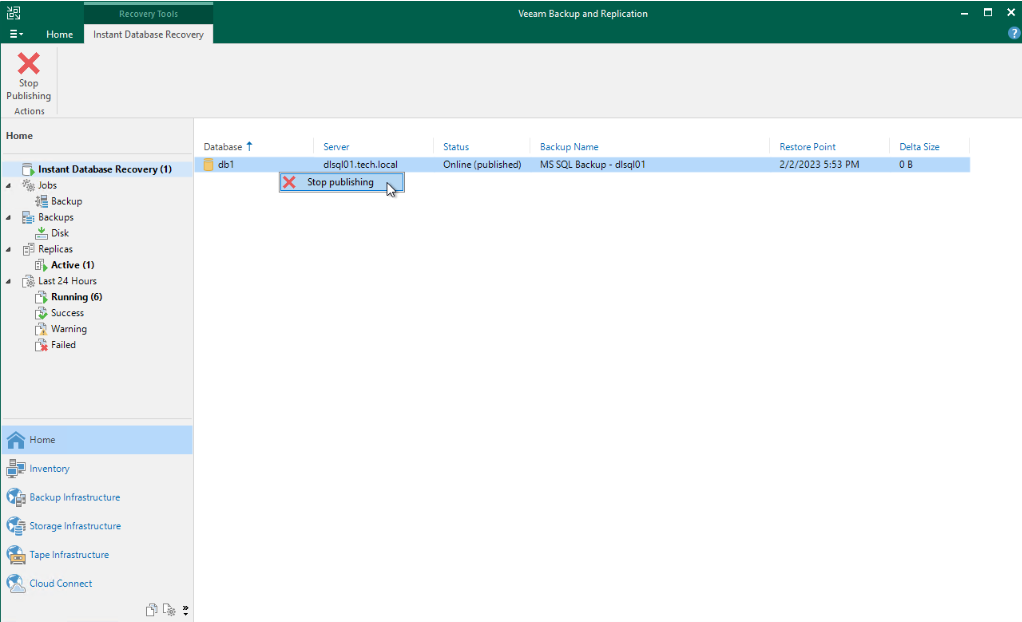 Go to Veeam Backup & Replication console, navigate to Home > Disk (Instant Recovery), right-click the stuck instant recovery session, and select Stop publishing.