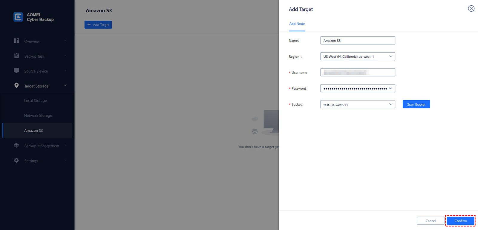 2. Enter your Amazon S3 credentials and click "Confirm".