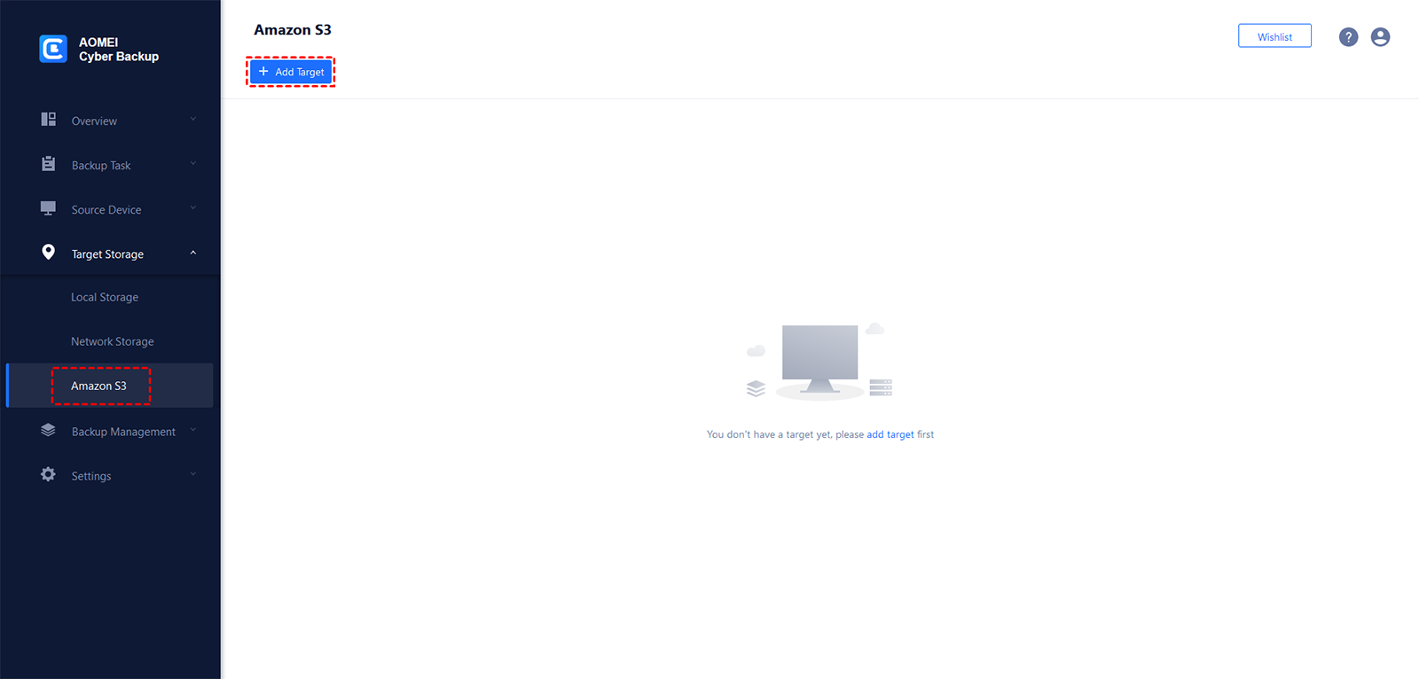 1. To use backup archive, you need to add Amazon S3 first. Click "Target Storage"-->"Amazon S3"-->"Add Target" to open the add target page.