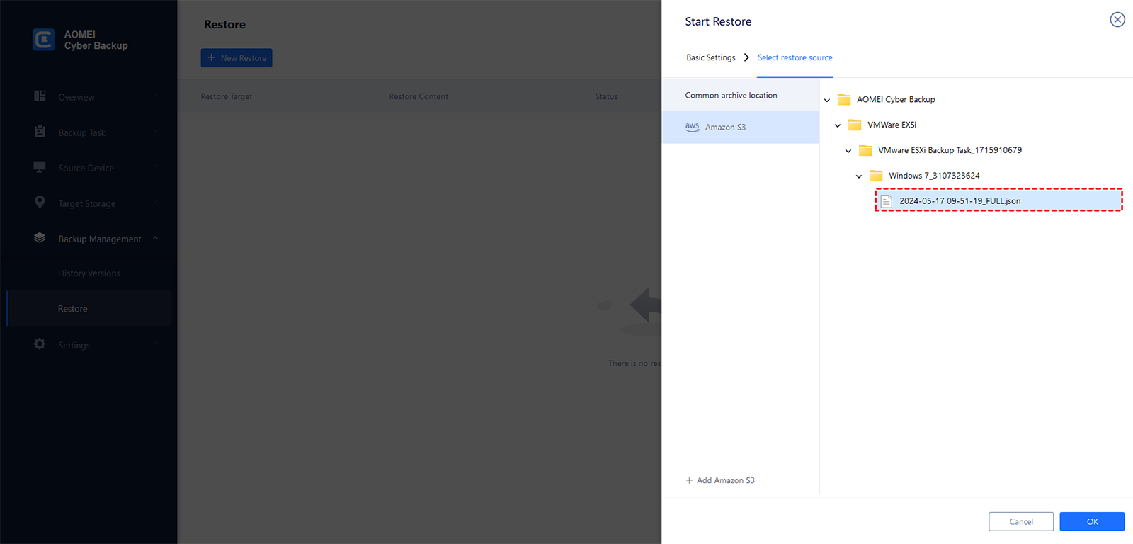 2. Click "New Restore"-->"Restore from Amazon S3".